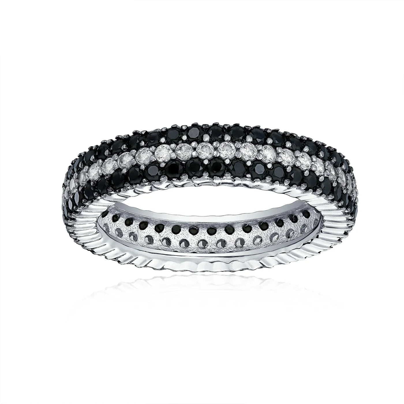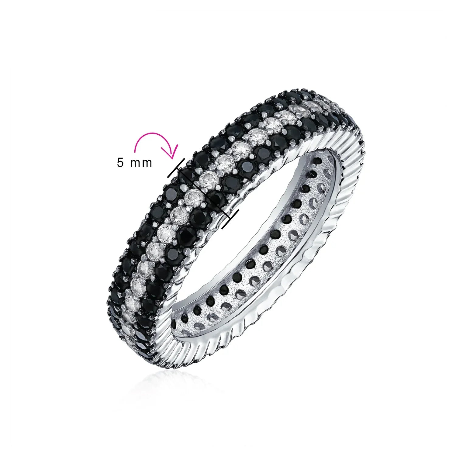 - CZ Eternity Band - This stunning black and white cubic zirconia band offers a refreshing twist on non-traditional statement wedding rings. Featuring two rows of black CZs and a central row of clear CZs, it delivers an edgy look while maintaining the classic pave setting cocktail ring style.