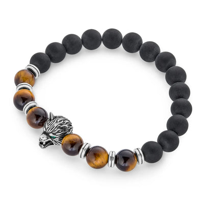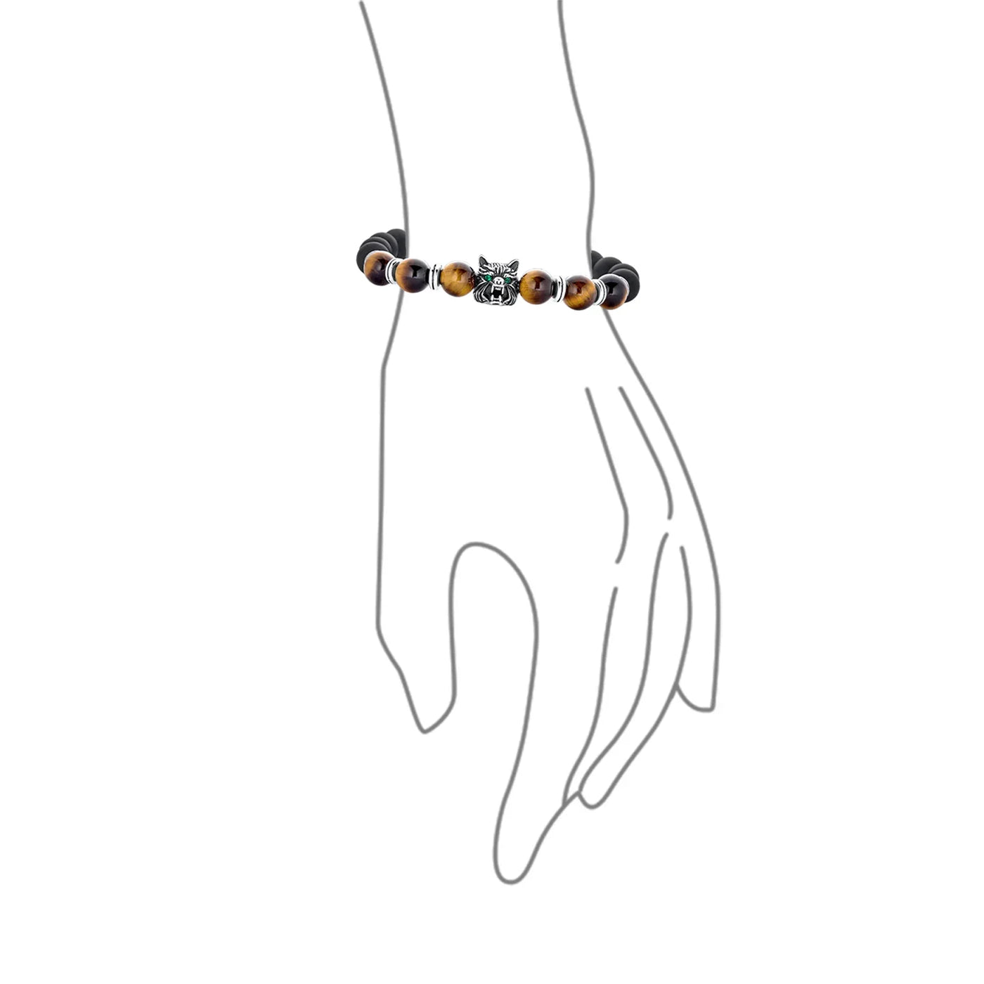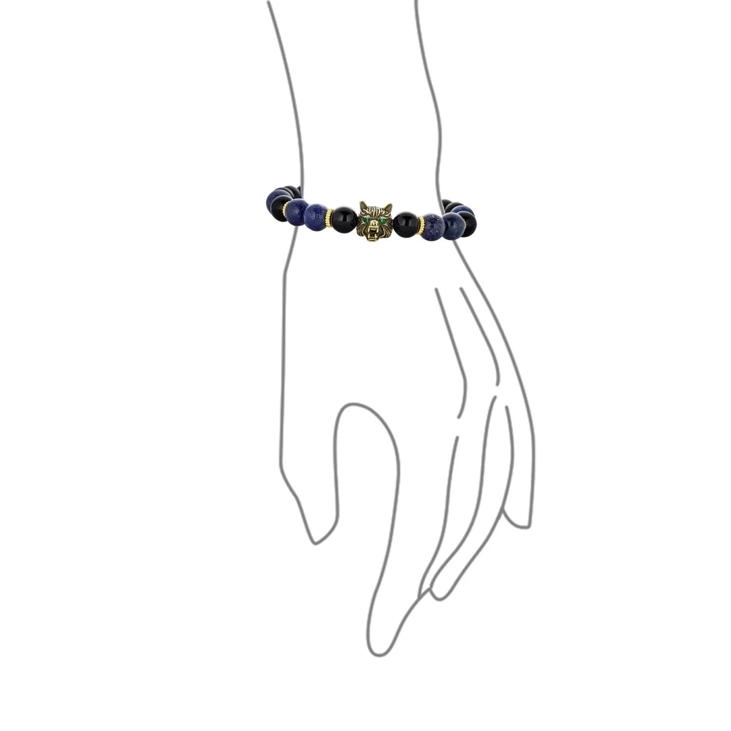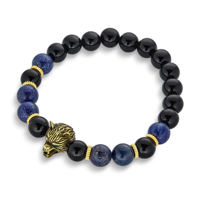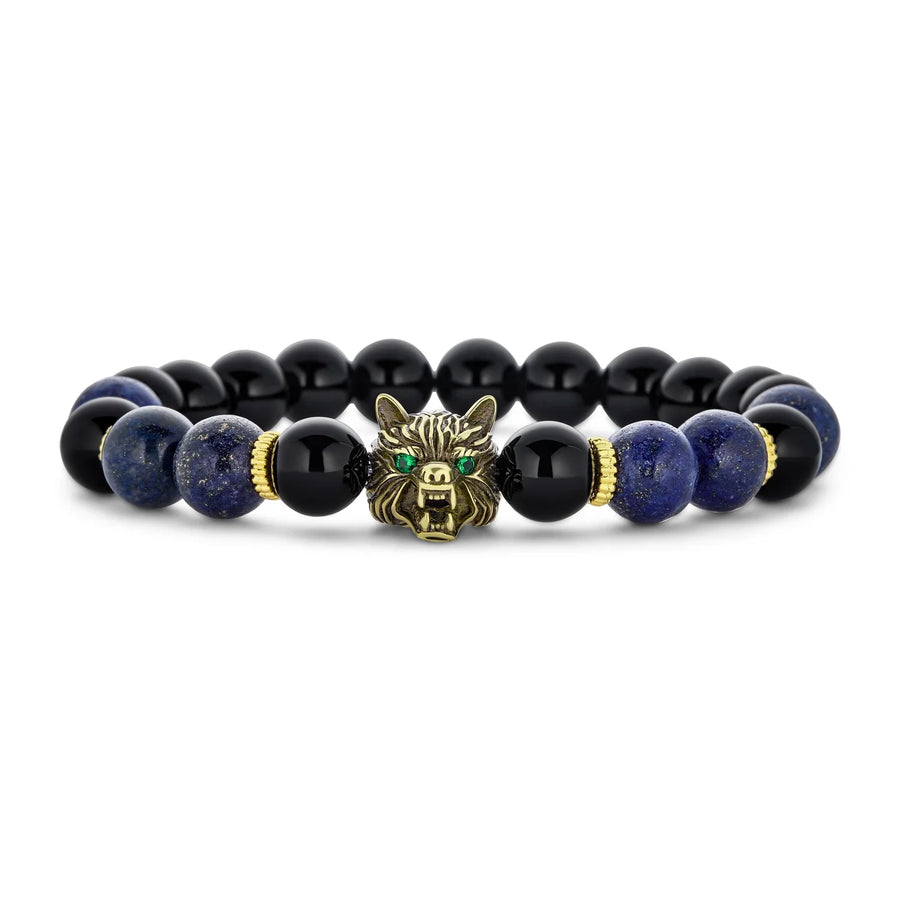 - Enhance your style with this captivating bead stretch bracelet, adorned with a strand of luxurious black onyx and blue Lapis beads. The centerpiece boasts a stunning gold oxidized plated Wolf face, complete with mesmerizing green crystal eyes, symbolizing power and courage. Embrace the positive energy and ward off negativity with the protective properties of gemstones.