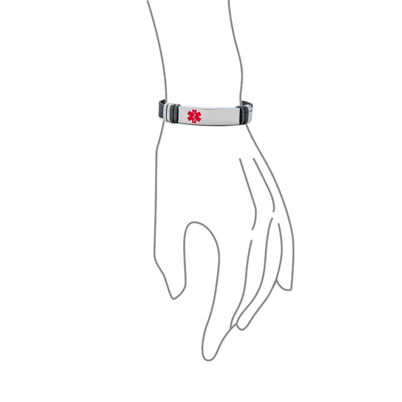 • Personalized custom engraved medical bracelet for men, made of durable, hypoallergenic stainless steel. Chic, rugged Belt Buckle Mesh style. Polished links with internationally recognized medical caduceus symbol. Engrave vital medical information or severe allergies. Fits up to an 8-inch wrist, with a 2-inch long, .35-inch wide ID bar. Secure fold-over clasp for active lifestyles. Stylish and practical Medical jewelry for men.