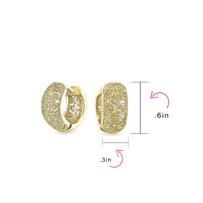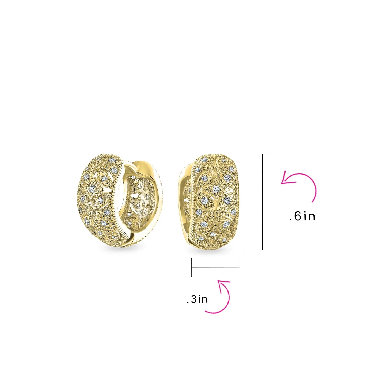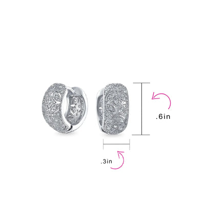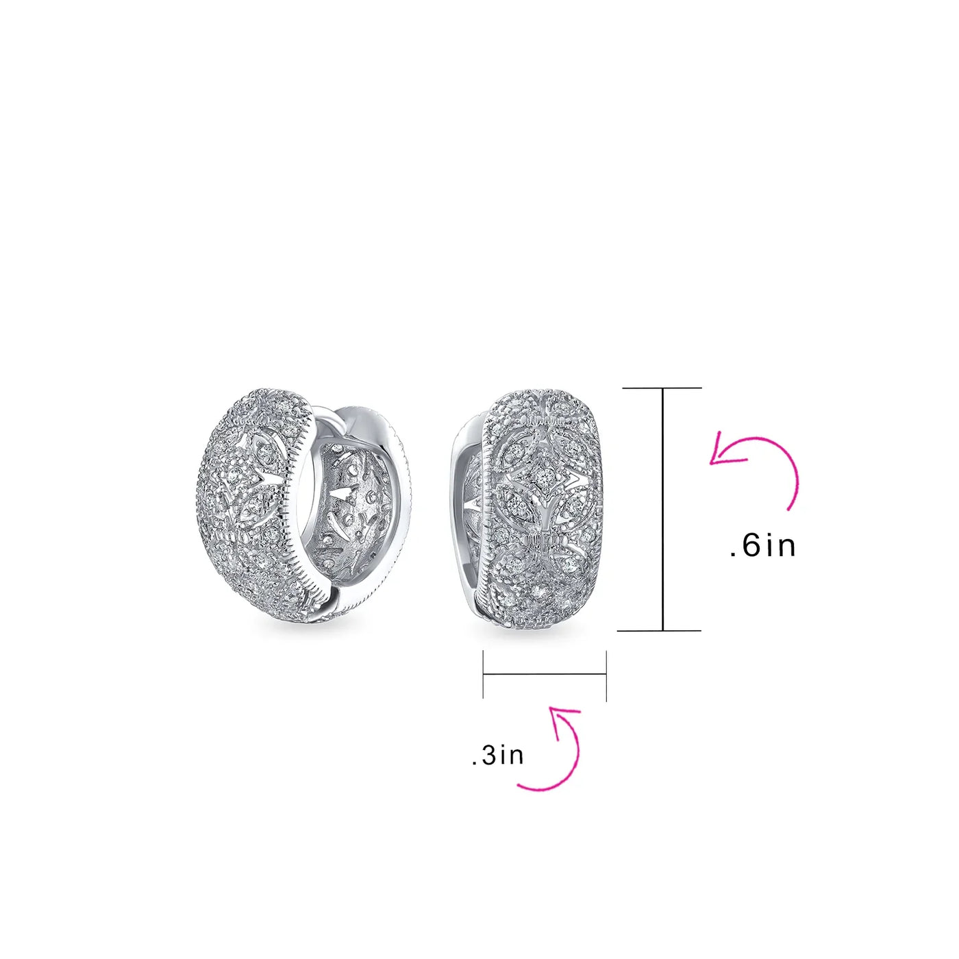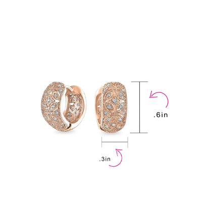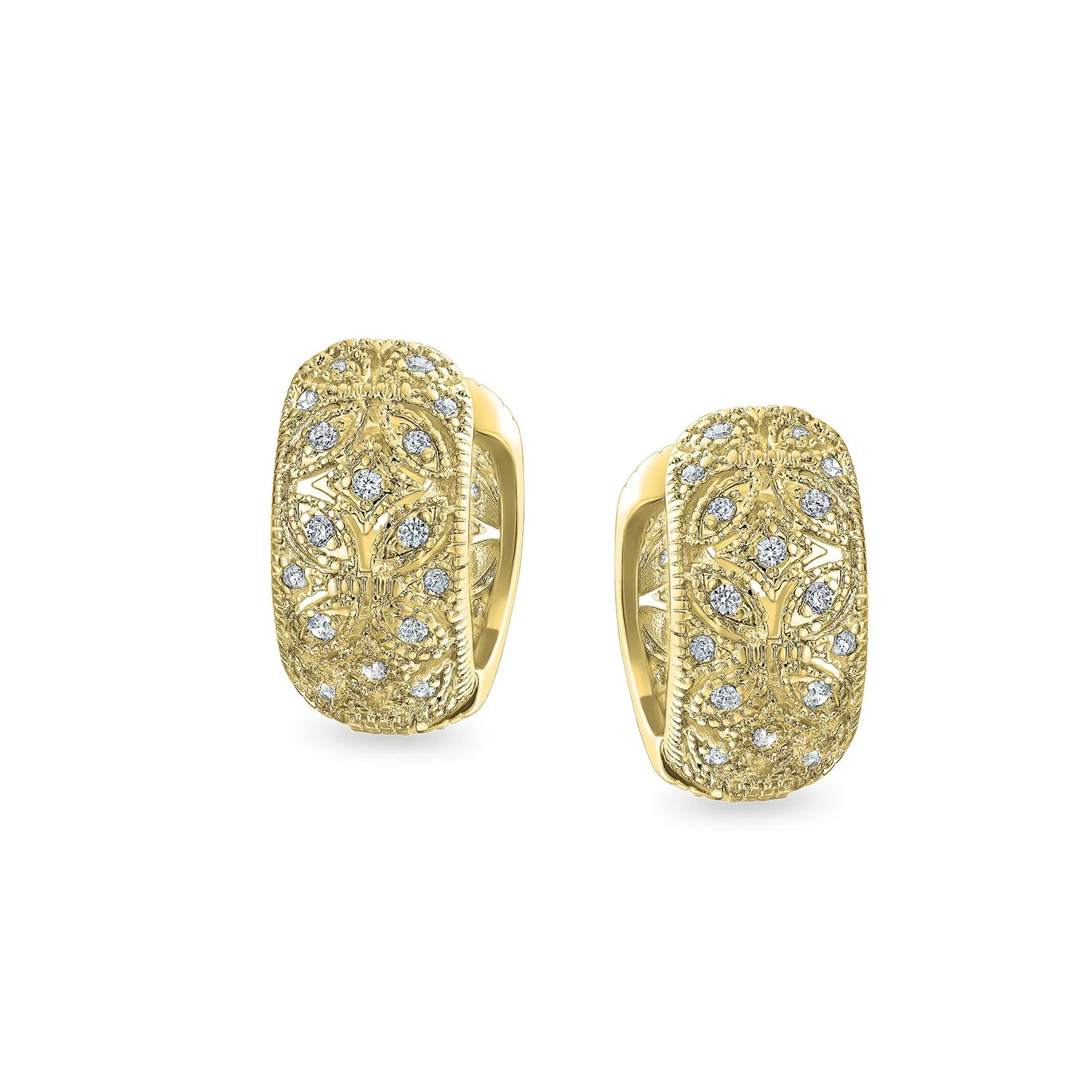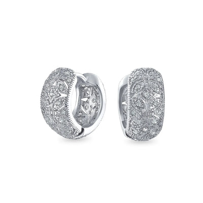 • This pair of Victorian Style Vintage Style flowers cubic zirconia huggie hoop earrings will never go out of style. These Vintage Style hoop earrings feature a snug fit to your ear which accentuates a highly polished look and are plated in rhodium so they never lose their shine. These beautiful huggie earrings hinge seamlessly open and snap securely closed. These flower cz earrings are truly comfortable in a Vintage Style design displaying a stunning look of sophistication and class. Do not miss out on these cz huggie hoops that give you the versatility you desire for day and night.