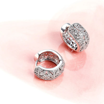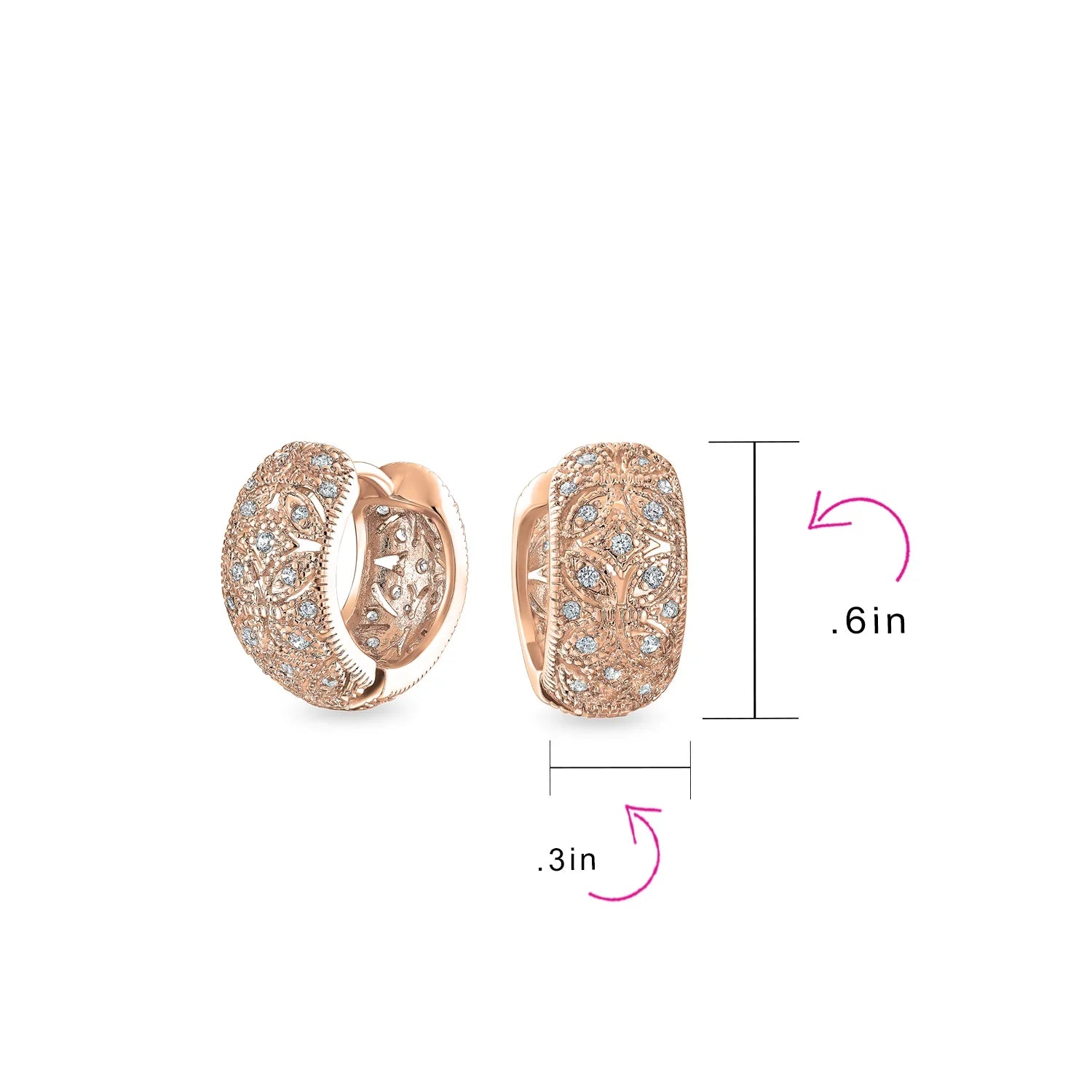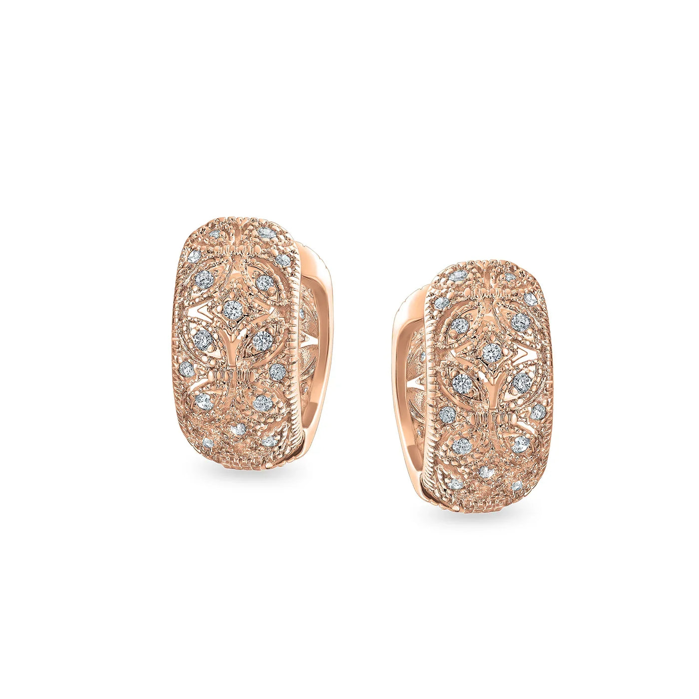 Victorian Filigree Flower CZ Hoop Earrings Silver Rose Gold Plated Huggie