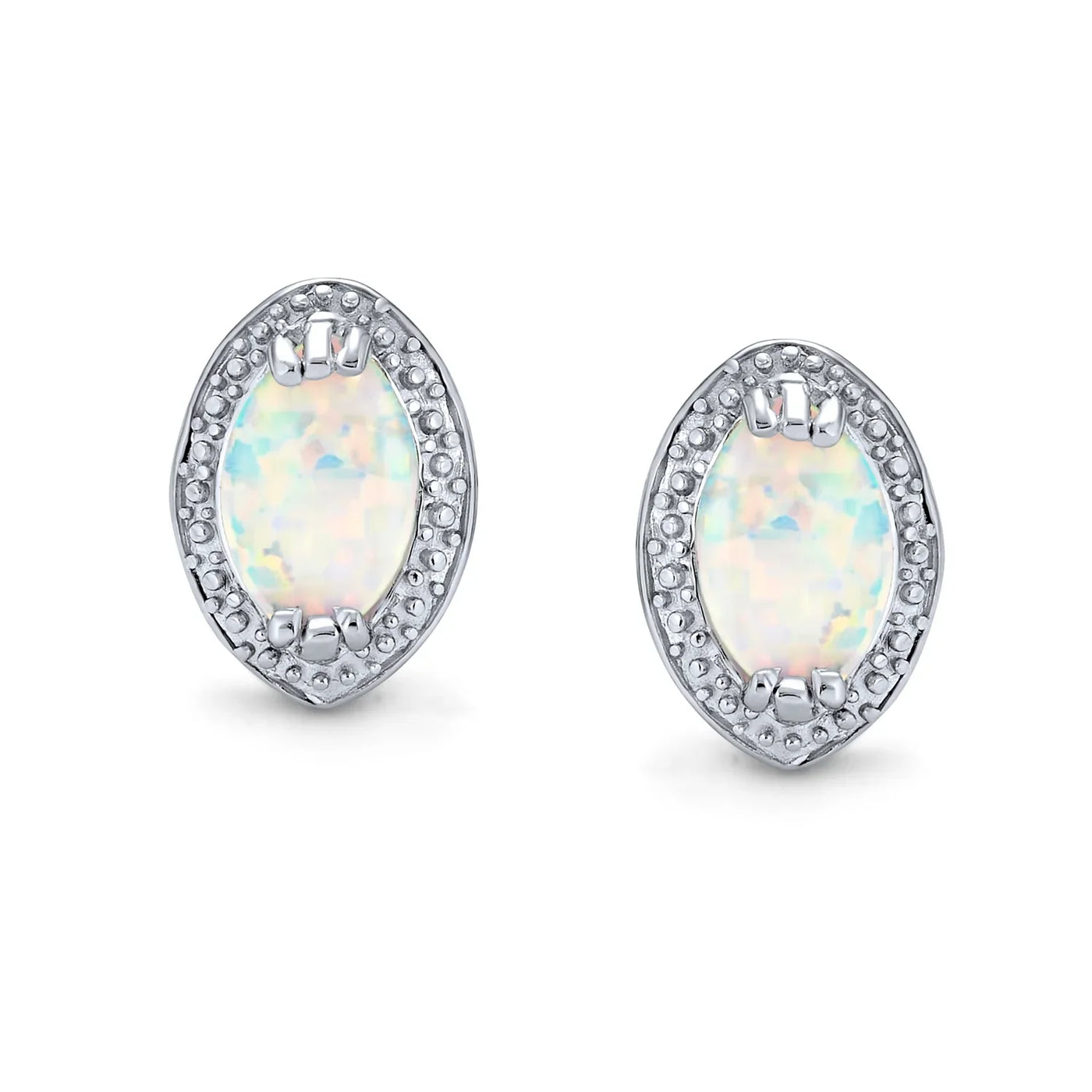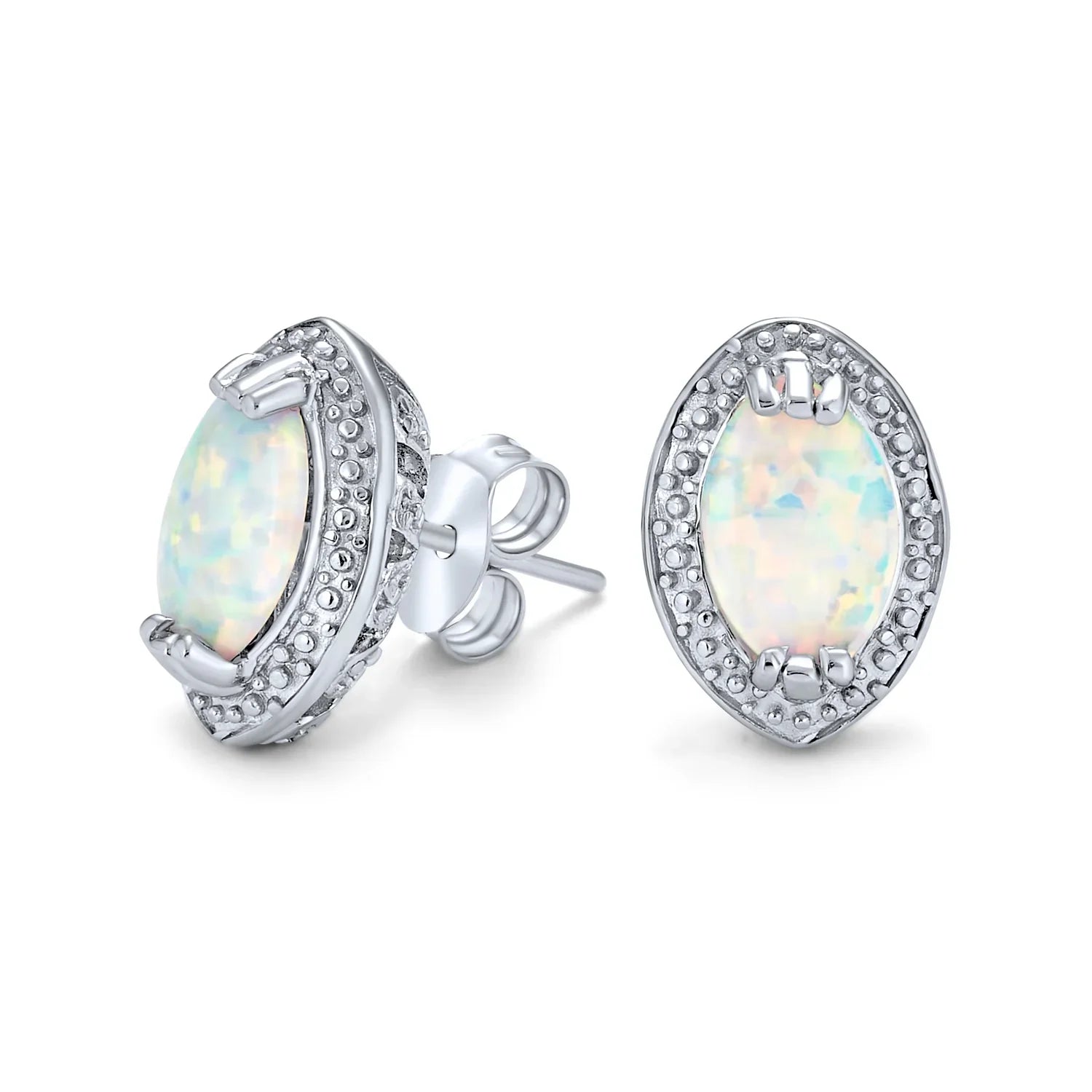 - These stunning Victorian Style stud earrings feature enchanting colors, making these Vintage Style earrings breathtaking. A dazzling oval Created White Opal gemstone sits in a 6 prong setting with elegant beaded detailing. Intricate cut-out designs on the sides give these chic Victorian Style Created Opal stud earrings a sophisticated look. Crafted from .925 sterling silver and rhodium plated to resist tarnish, each Created Opal earring sits on a secure friction back post.