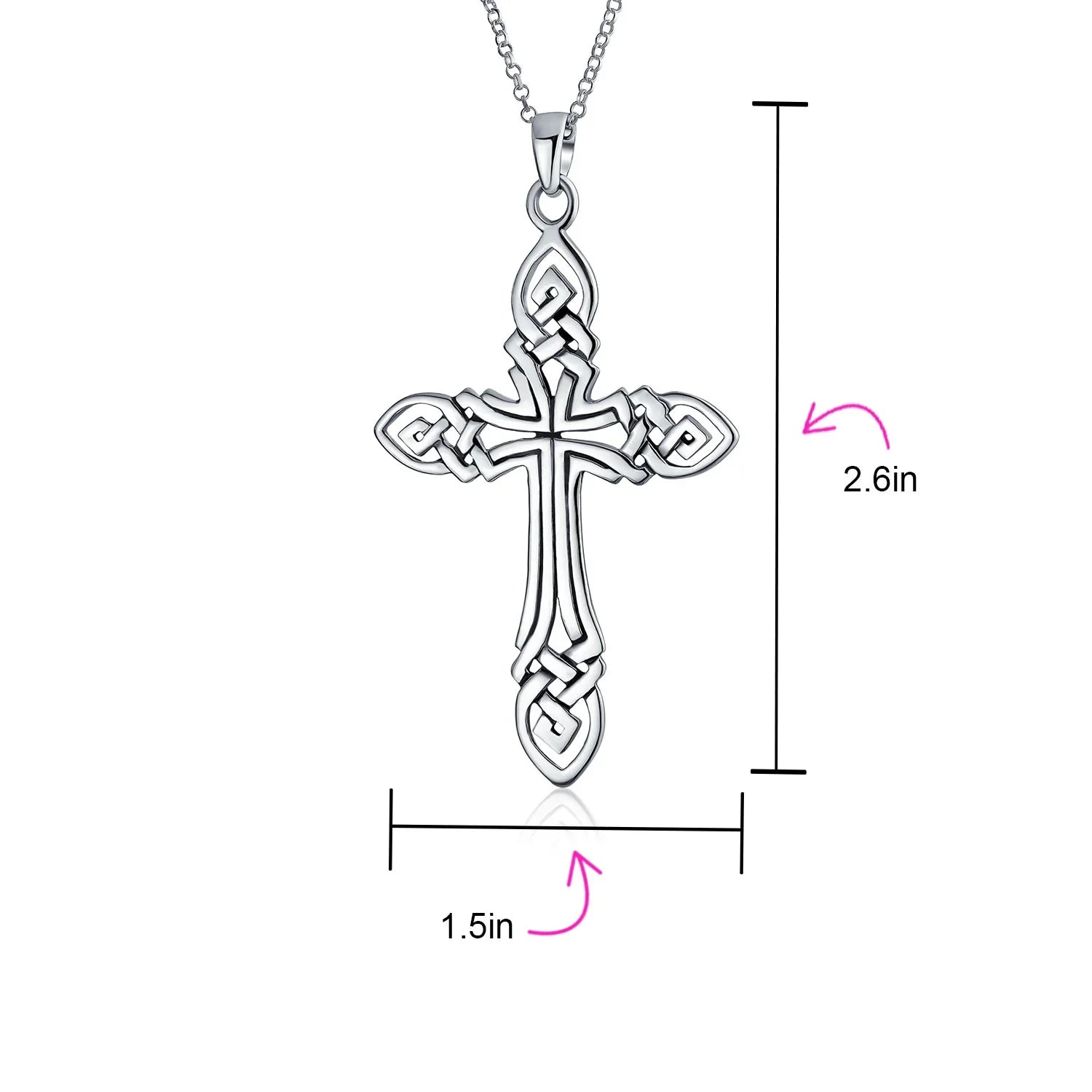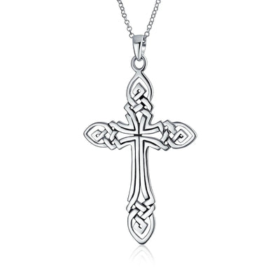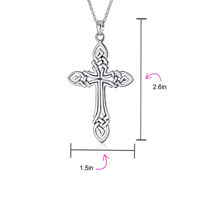 - Showcase your faith and style with our fine Celtic knot jewelry. This .925 Sterling Silver Celtic cross necklace features an intricate, eye-catching design. Embrace ancient Celtic traditions in a modern way. Celtic jewelry, dating back to the 800s, is a key part of Irish heritage. The continuous looping design symbolizes eternity and interconnectedness. Despite its large size, the cross pendant is lightweight. It measures 2.5 inches in length and 1.5 inches in width. Order now for a meaningful Father's Day gift.