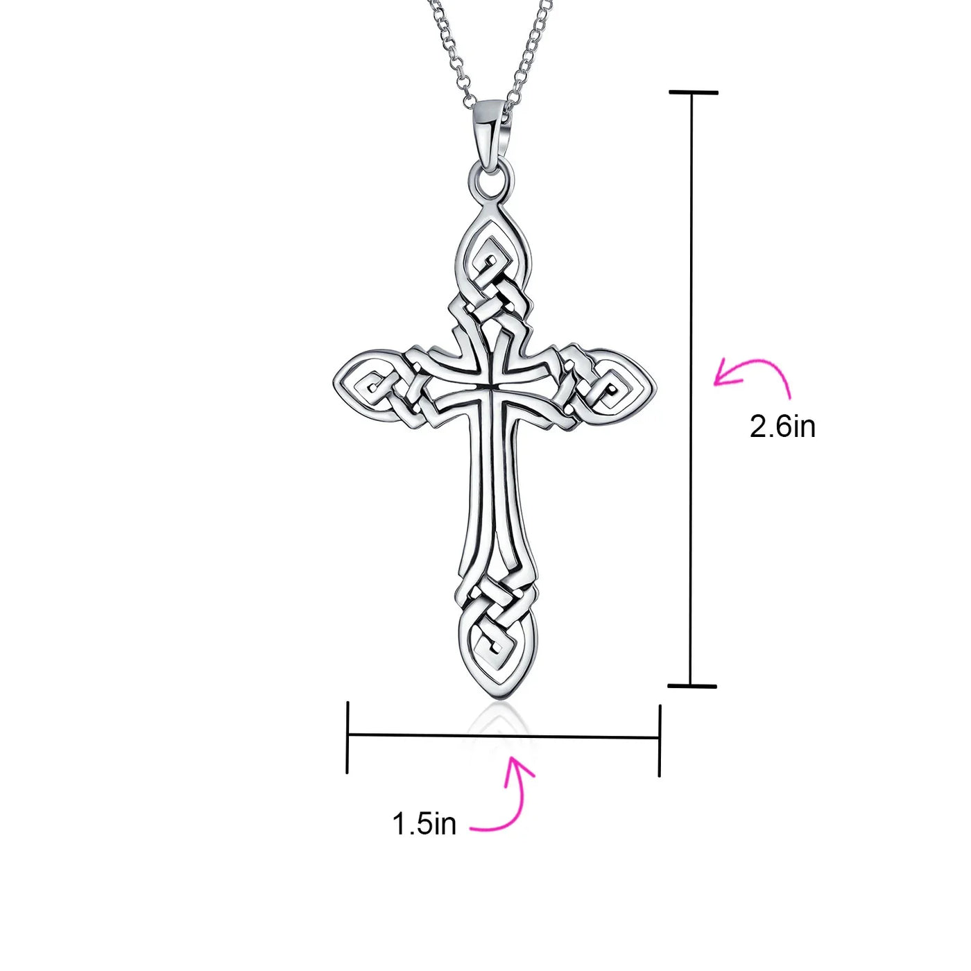 - The very eye catching and intricate design on our newest .925 Sterling Silver Celtic cross necklace is a sensational way to embrace the ancient Celtic traditions in a modern way. This 2.5 Inch necklace is sure to stand out, with sterling silver, and 18in chain. This is the perfect Easter wear to impress as you recognize your faith and religious devotion and honor your heritage.