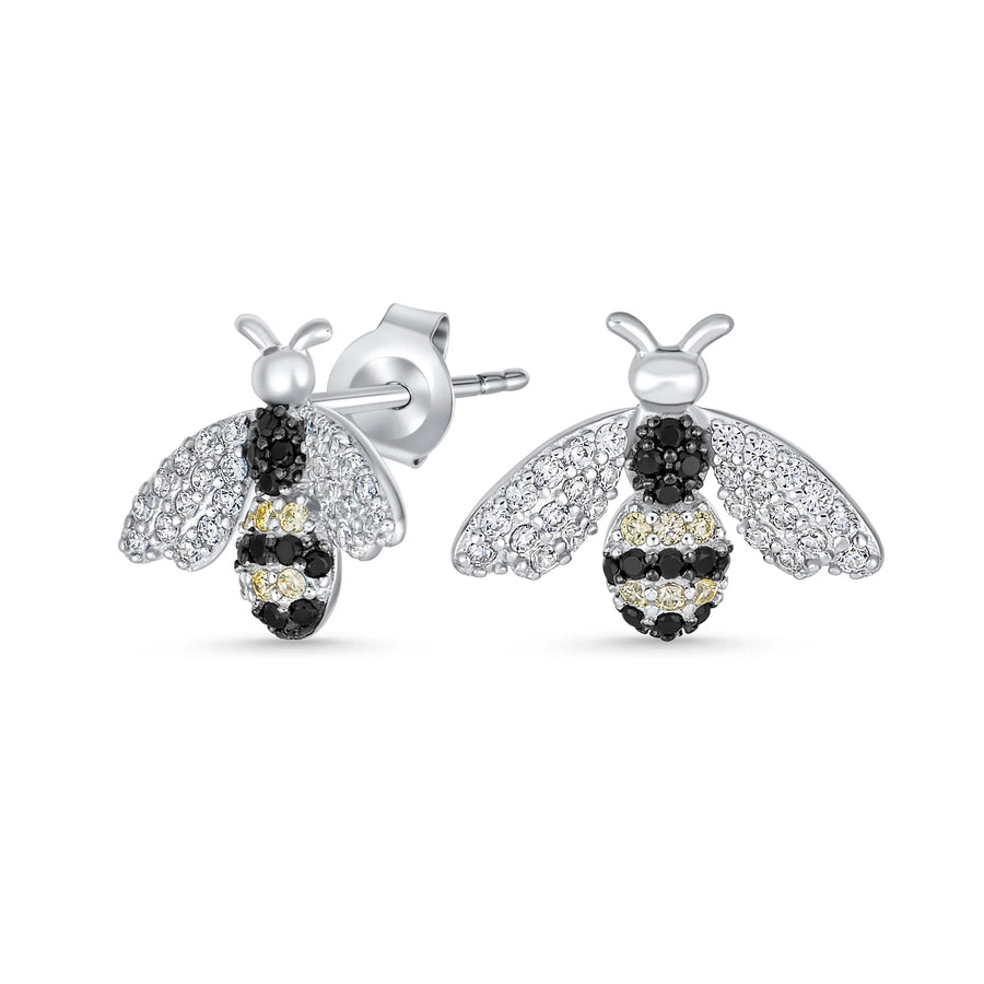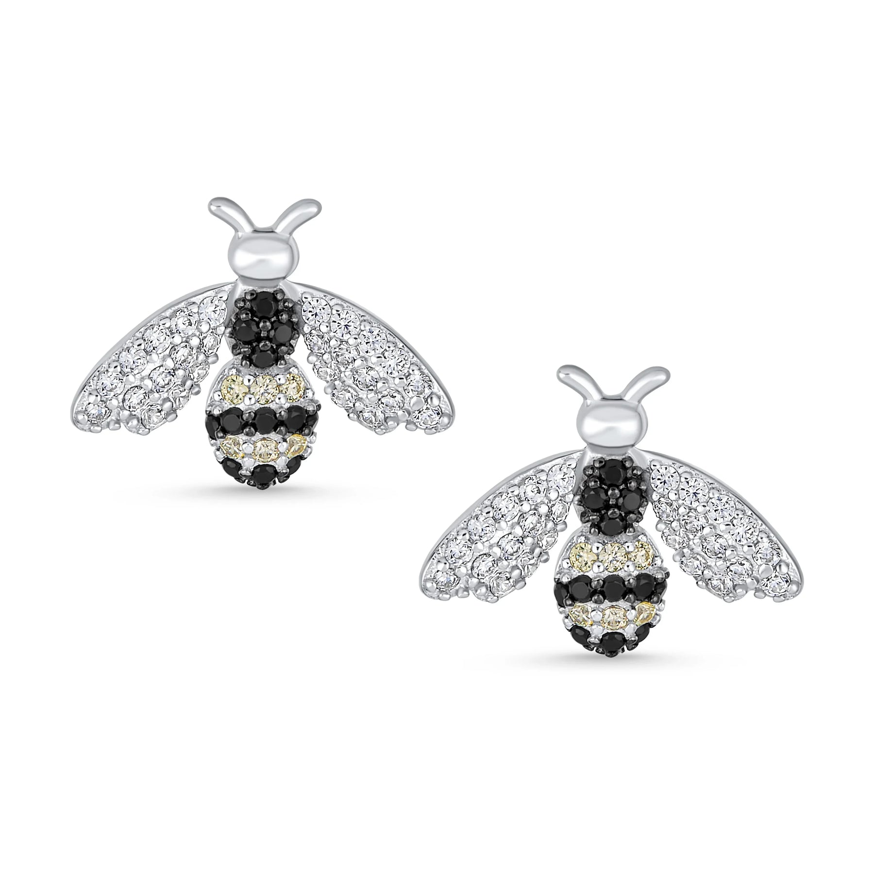 - Stay trendy with these bumble bee earrings will surely capture your heart. Introducing our charming animal stud earrings, designed with a delightful bumble bee motif. These earrings are adorned with sparkling black czs accents, adding a touch of elegant whimsy and shimmer to your style.