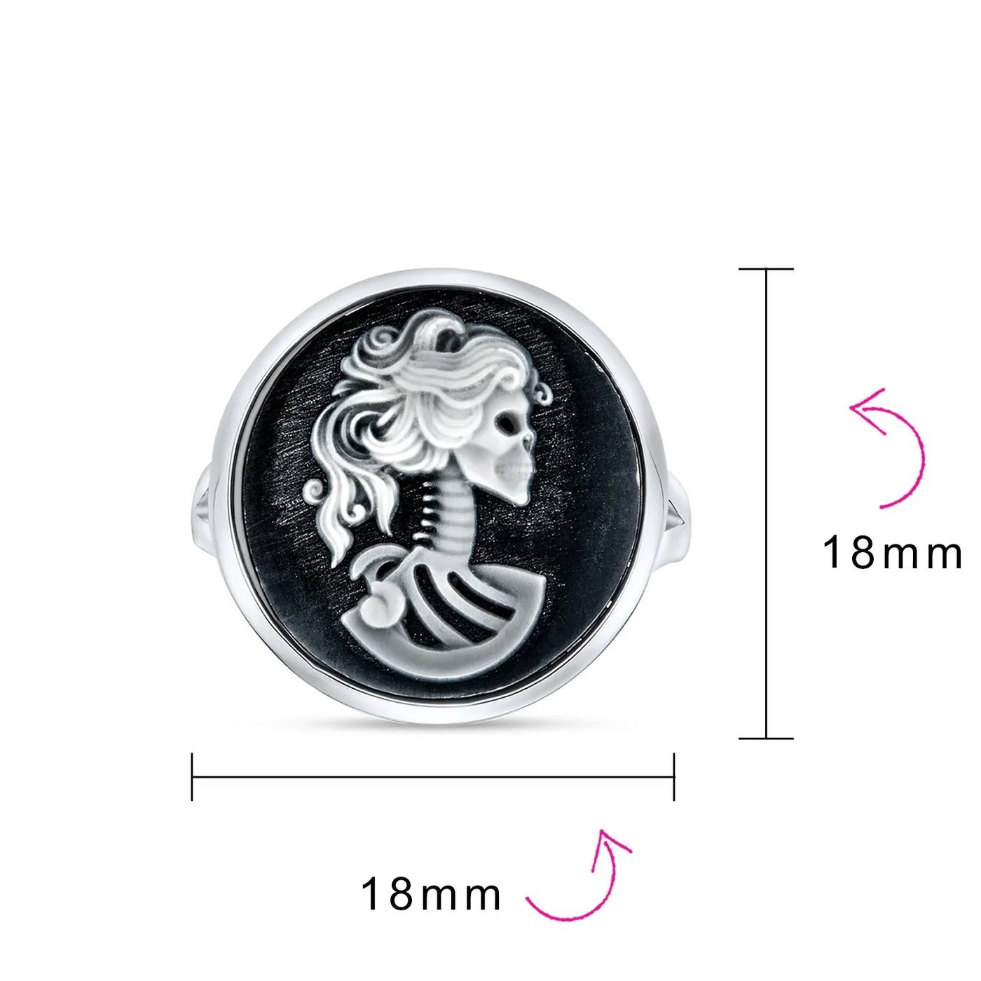 - This black and white seductive young female portrait skeleton cameo statement ring is haunting. Victorian style skeleton goddess with a flower in her hair, framed in sterling silver takes this cameo jewelry to the next level.