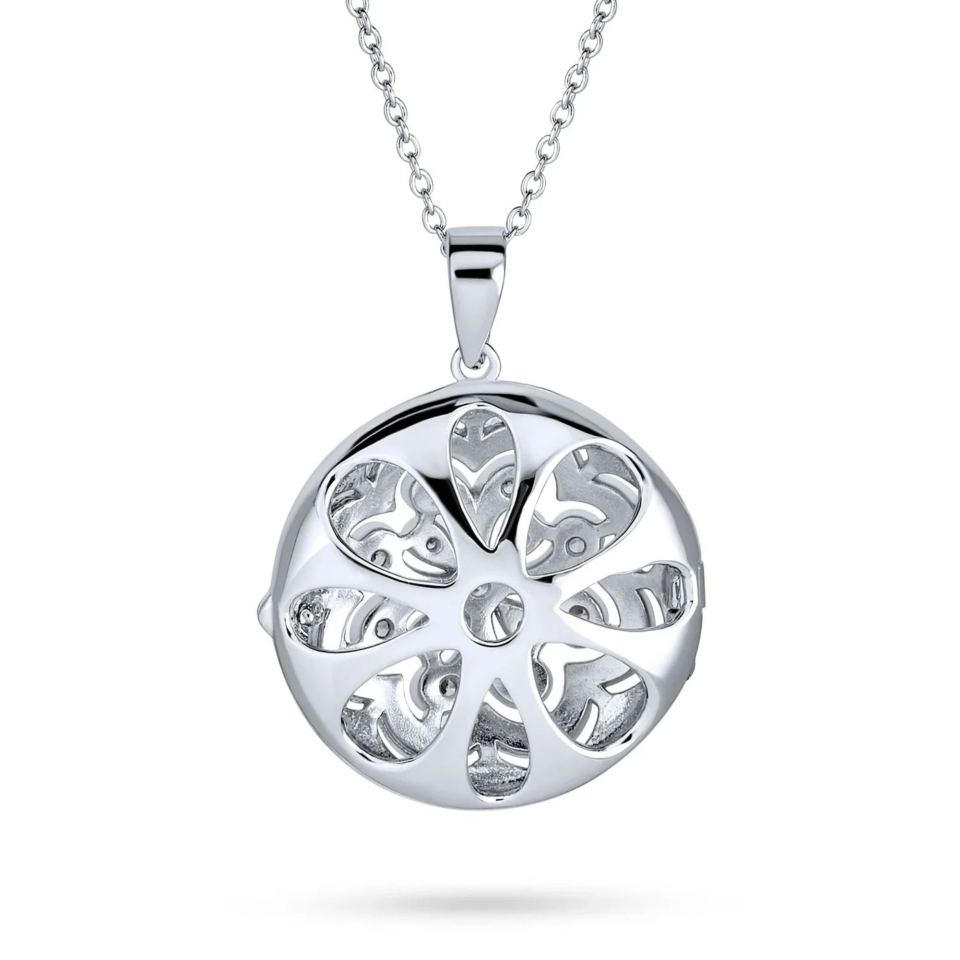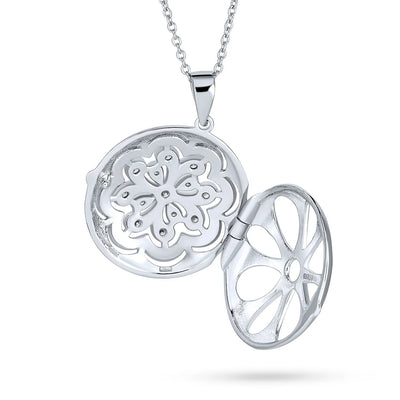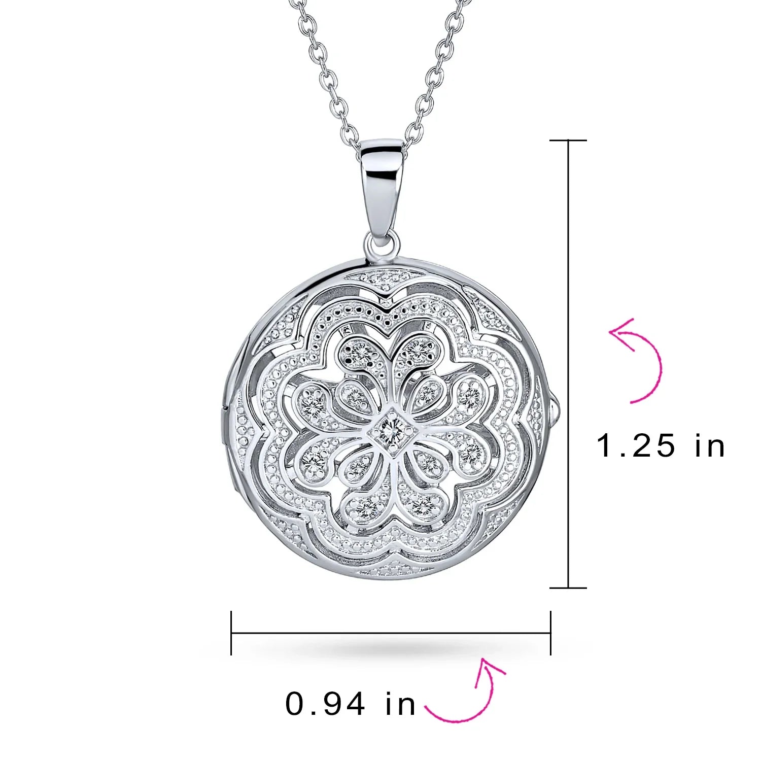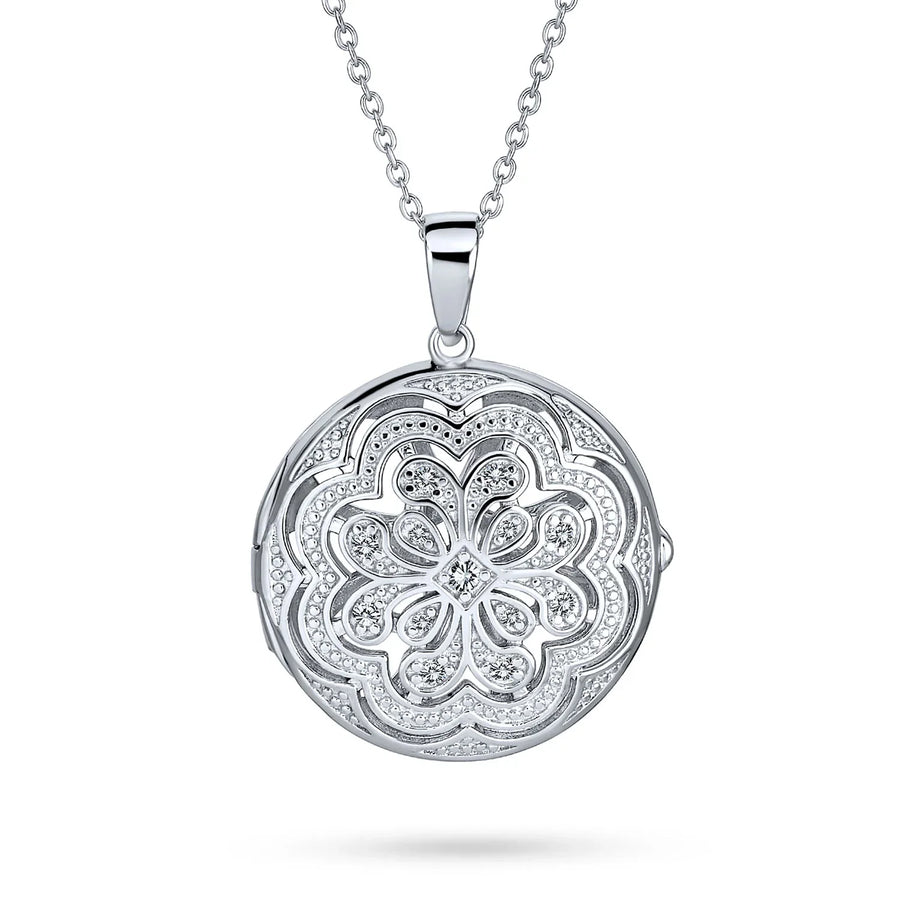 - Vintage Style Victorian locket necklace can be filled with a small photo, memento, or poem. Our CZ round pendant necklace has the look of a delicate piece of lace, shimmering with pave cz embellishment, designed in filigree 925 silver. Insert a felt cloth, cotton with your favorite perfume or aromatherapy essential oil for anxiety relief or a touch of romance. This .925 sterling silver design floral locket can hold any sentimental keepsakes. Antique style open filigree make this a romantic gift.