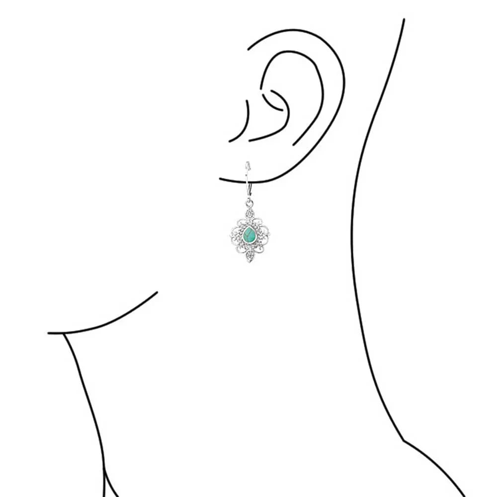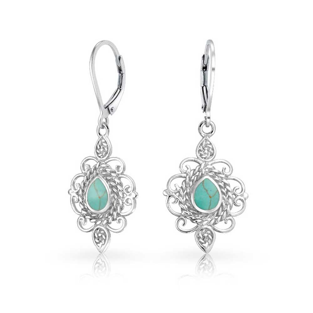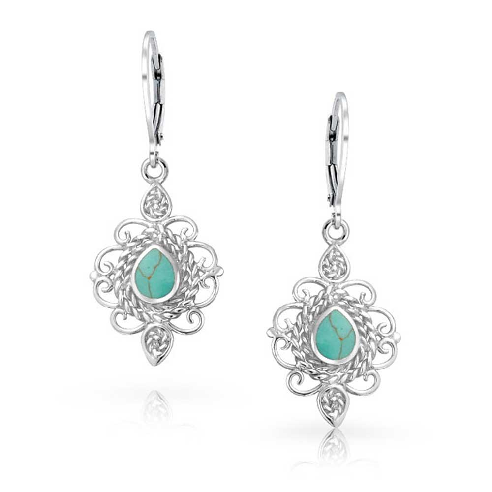 - Enhance your vintage elegance with a vibrant touch of color through these exquisite sterling silver dangle lever back earrings, featuring a pear-shaped Stabilized Turquoise bead at the heart of a captivating filigree design.