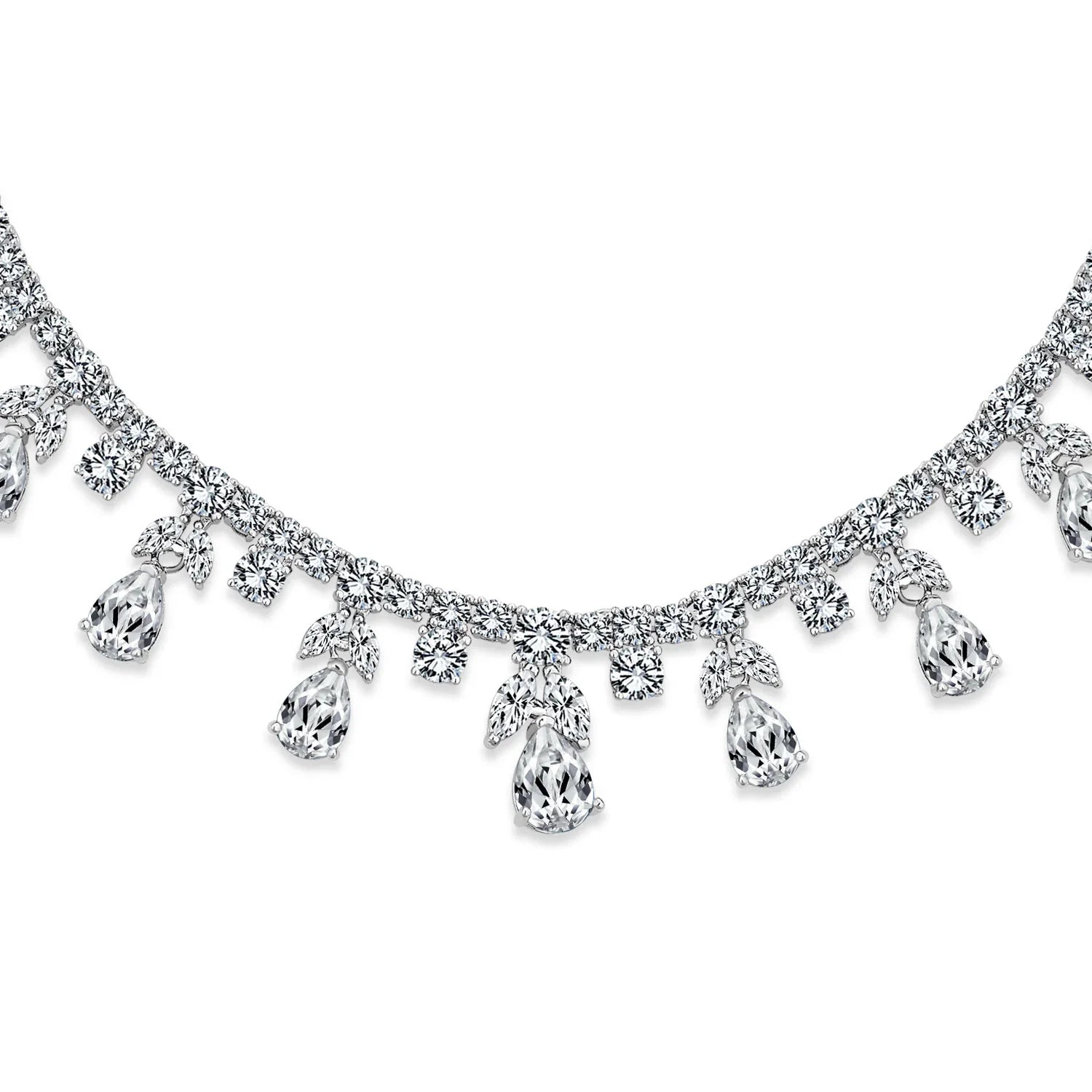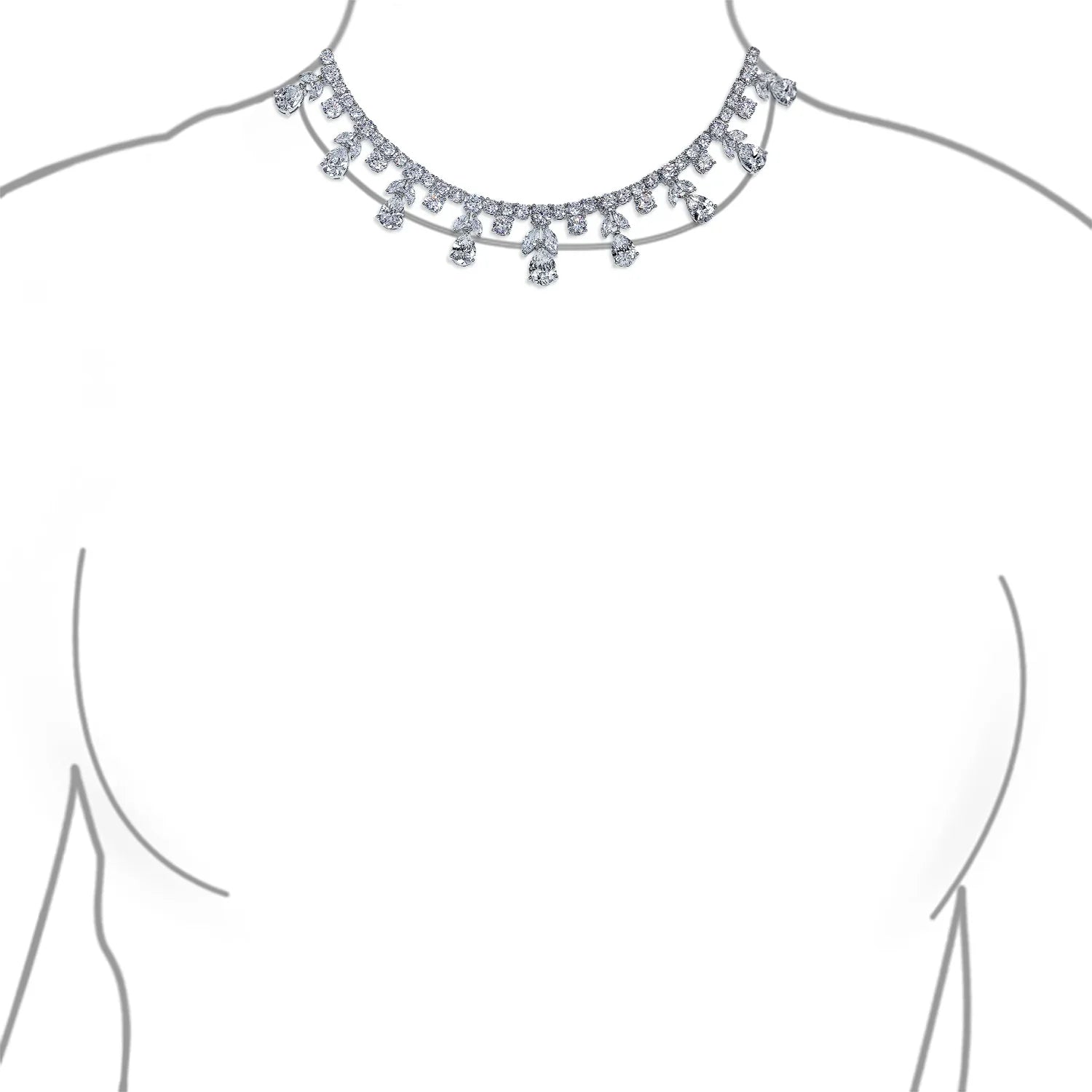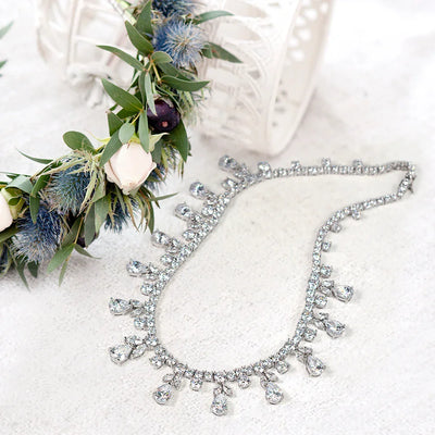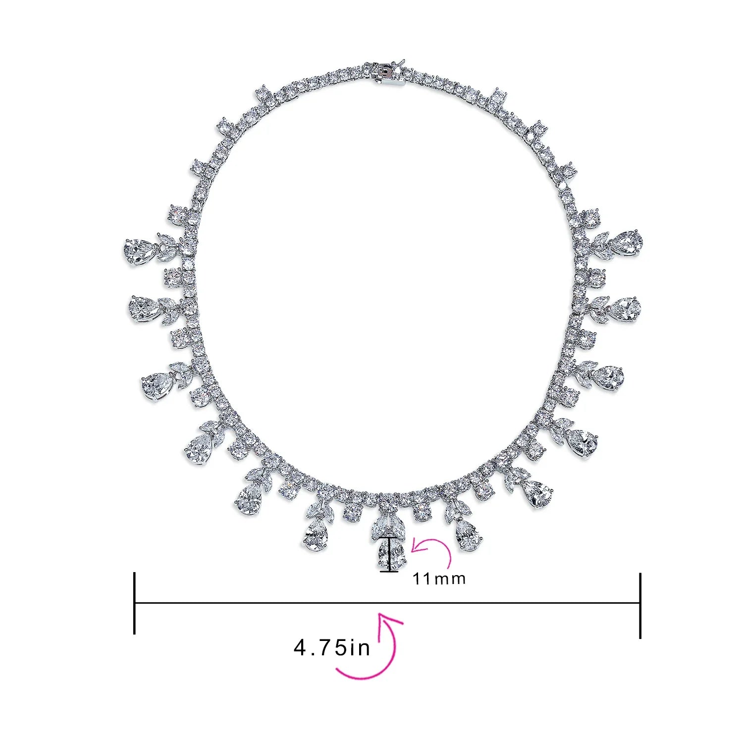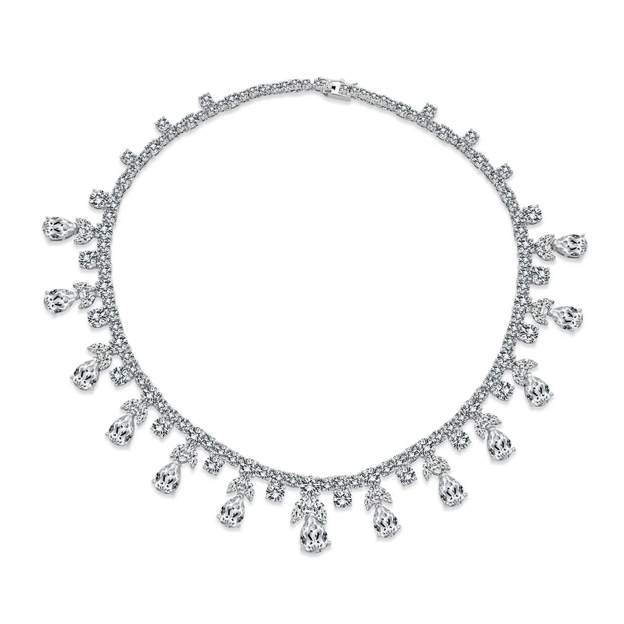- ELEVATE YOUR BRIDAL LOOK: Make a stunning statement as you walk down the aisle or attend any formal event with this sumptuous bridal choker necklace. The exquisite design features pear-shaped CZ stones gracefully dipping from a shimmering embellished choker. ELEGANT DESIGN: This bridal choker necklace is designed to elevate your overall look and add an extra touch of sophistication to your special day. SPARKLING CZ STONES: The pear-shaped CZ stones beautifully cascade from the embellished choker, creating a mesmerizing sparkle that will catch everyones attention. Not just for weddings, this versatile piece can also be worn at other formal events such as galas, proms, or anniversary celebrations.