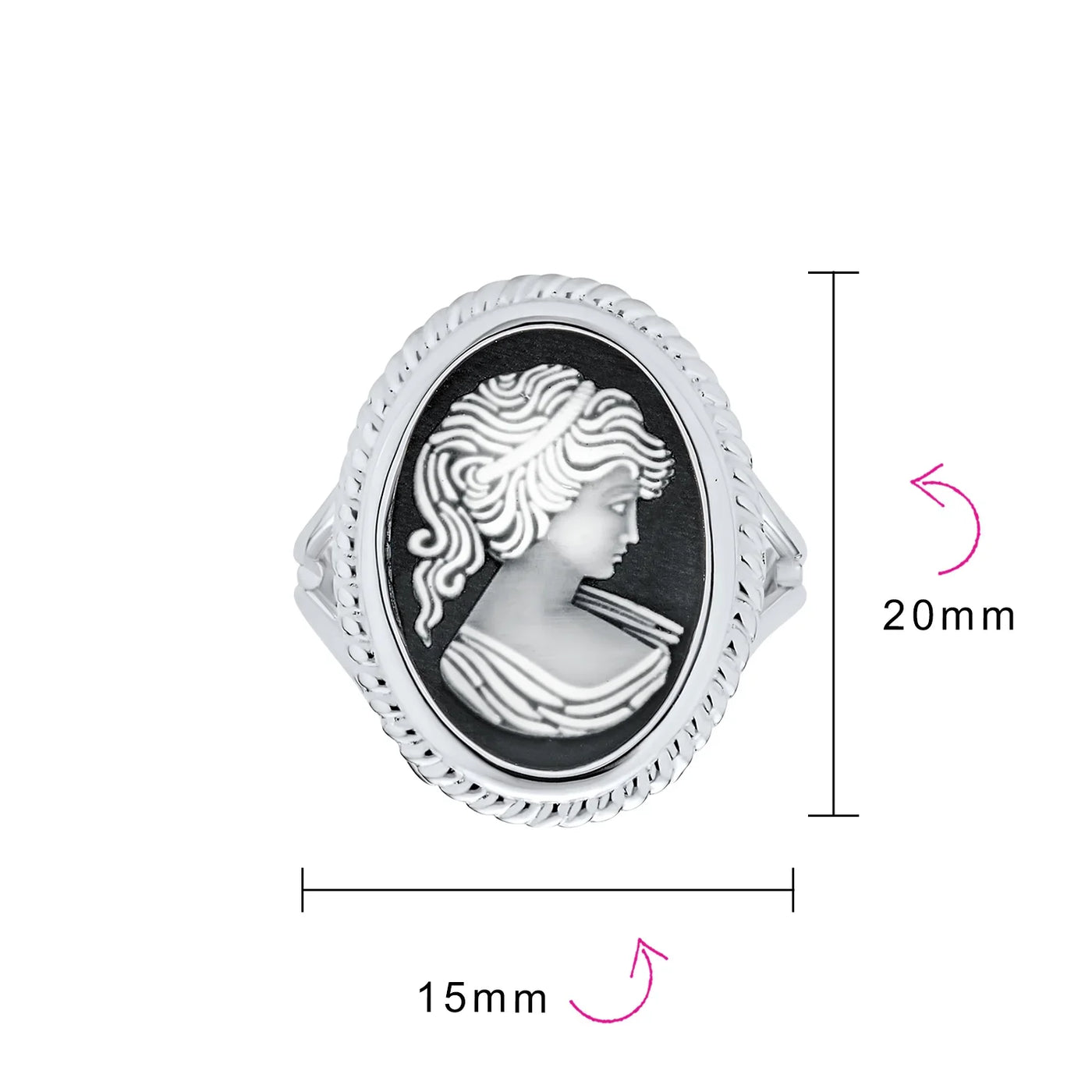 - This, black & white cameo ring wrapped in .925 sterling silver vintage frame. Features the profile portrait of a young lady in a reflective pose. This style of craving is known as Jasperware. This mother of pearl cameo rings gives new life to a Victorian staple. This regal lady has a chic black background and is hauntingly elegant. Our Mother of Pearl Cameo pendant is perfect for romantic souls who like a vintage look.
