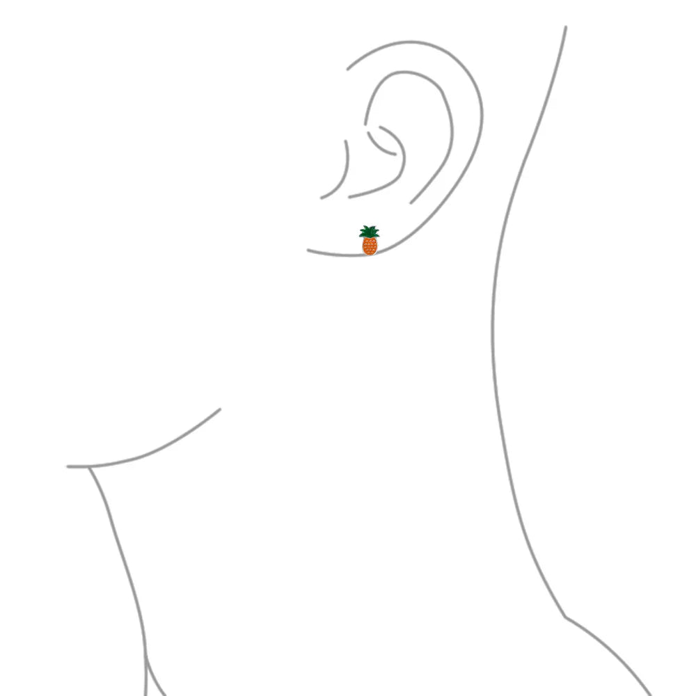 - Elevate your style with cute pineapple stud earrings. Crafted in sterling silver with vibrant green and orange enamel. Secure post backing ensures comfort. Perfect for young fashionistas. Ideal tropical jewelry gift for special occasions. Order multiple pairs today!