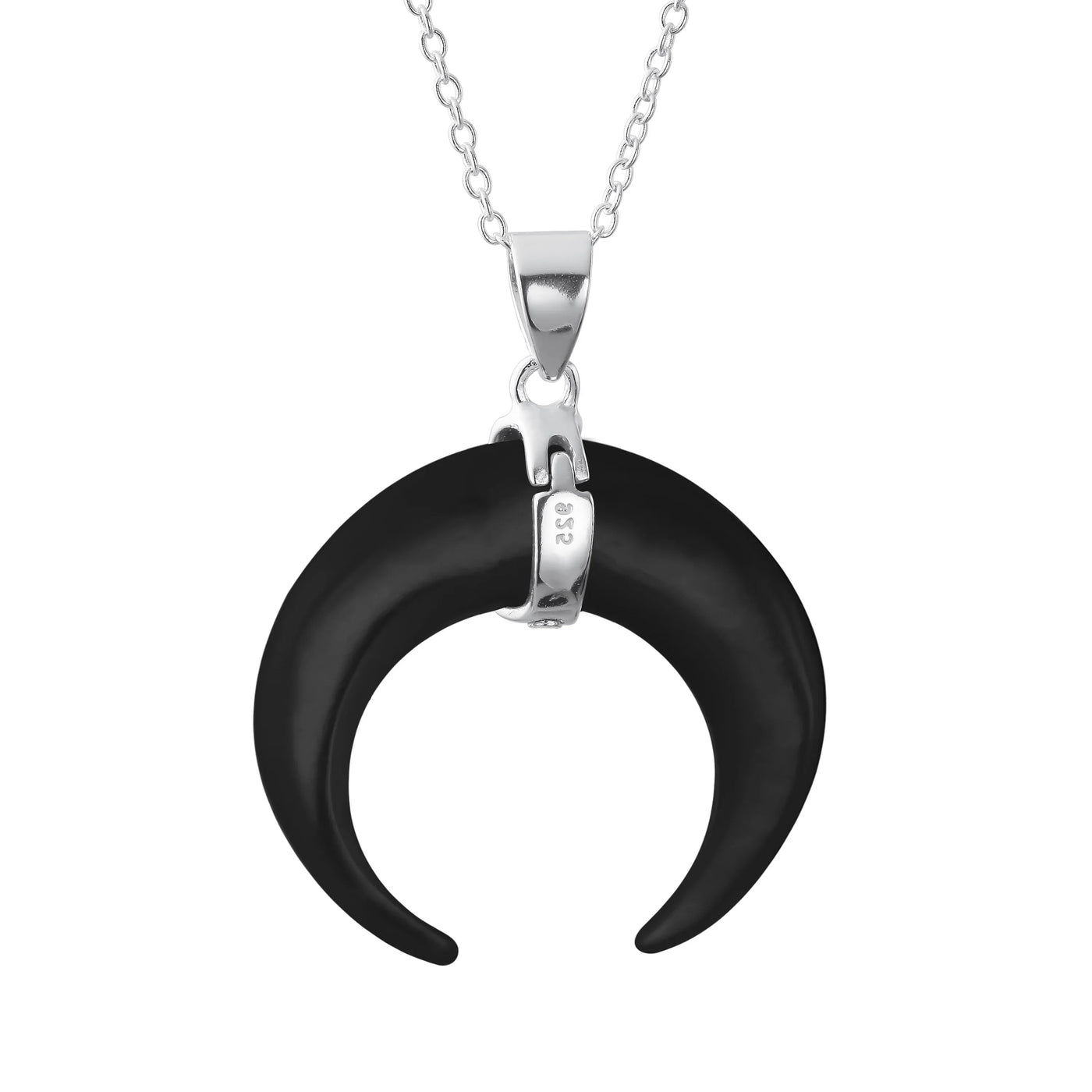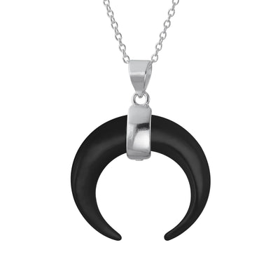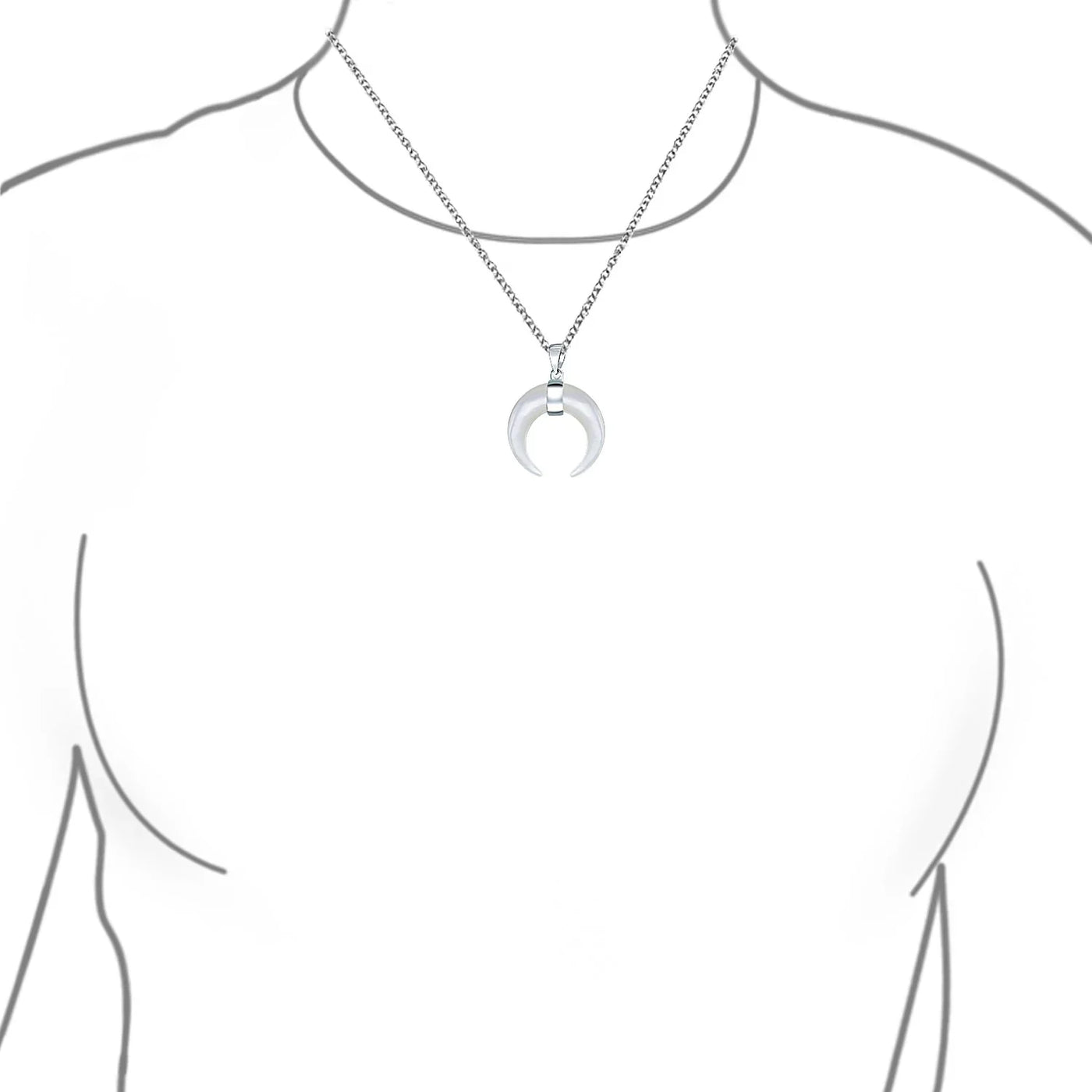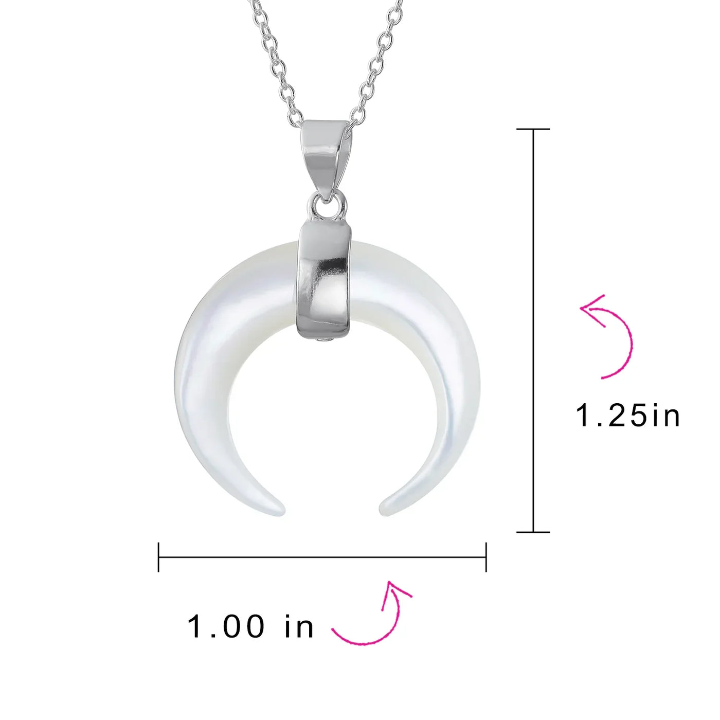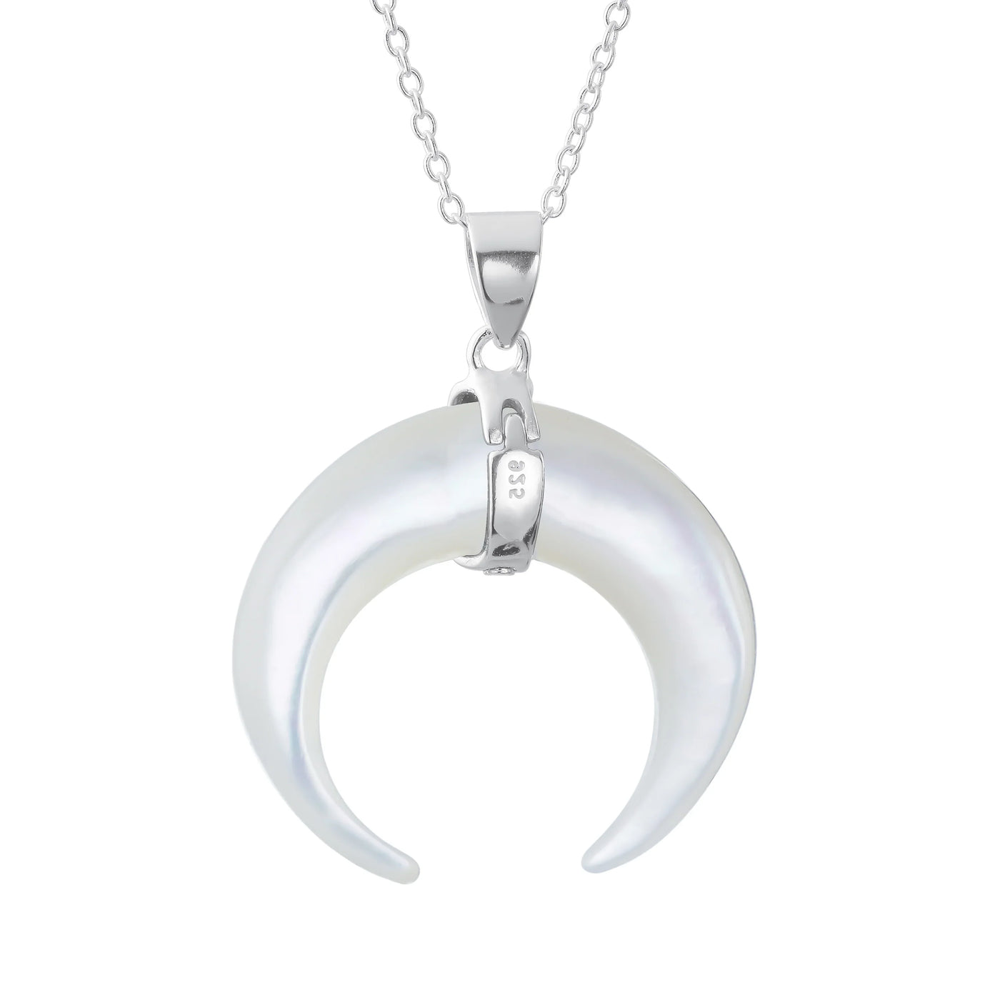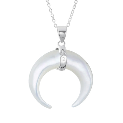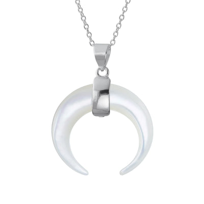 - Elevate your style with this exquisitely crafted pendant necklace that effortlessly combines tribal flair with Boho chic vibes. The striking waning crescent moon pendant, adorned with a captivating White Shell MOP, adds a touch of boldness to your ensemble. Suspended from a shimmering .925 silver cable chain, this necklace is a true statement piece that will enhance any outfit.