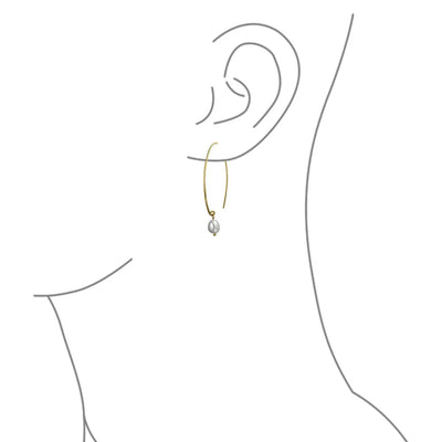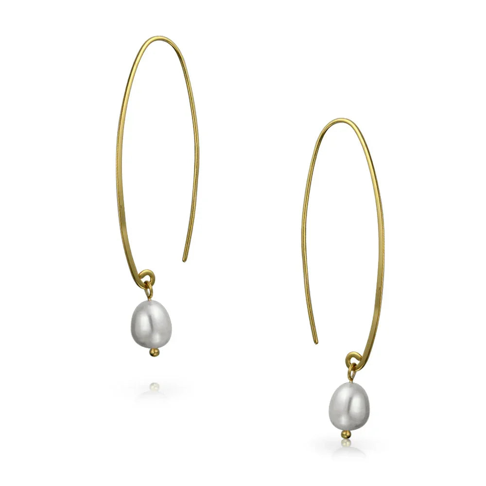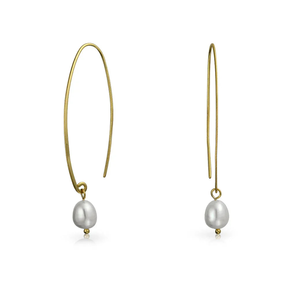 - These contemporary and elegant pearl earrings showcase a lustrous round freshwater cultured white pearl drop, gracefully hanging from a gold-plated sterling silver threader fish hook wire. Perfect for June birthstone jewelry, they capture the latest trend in bridal earrings.