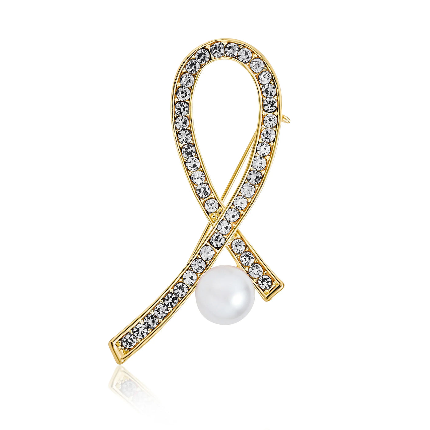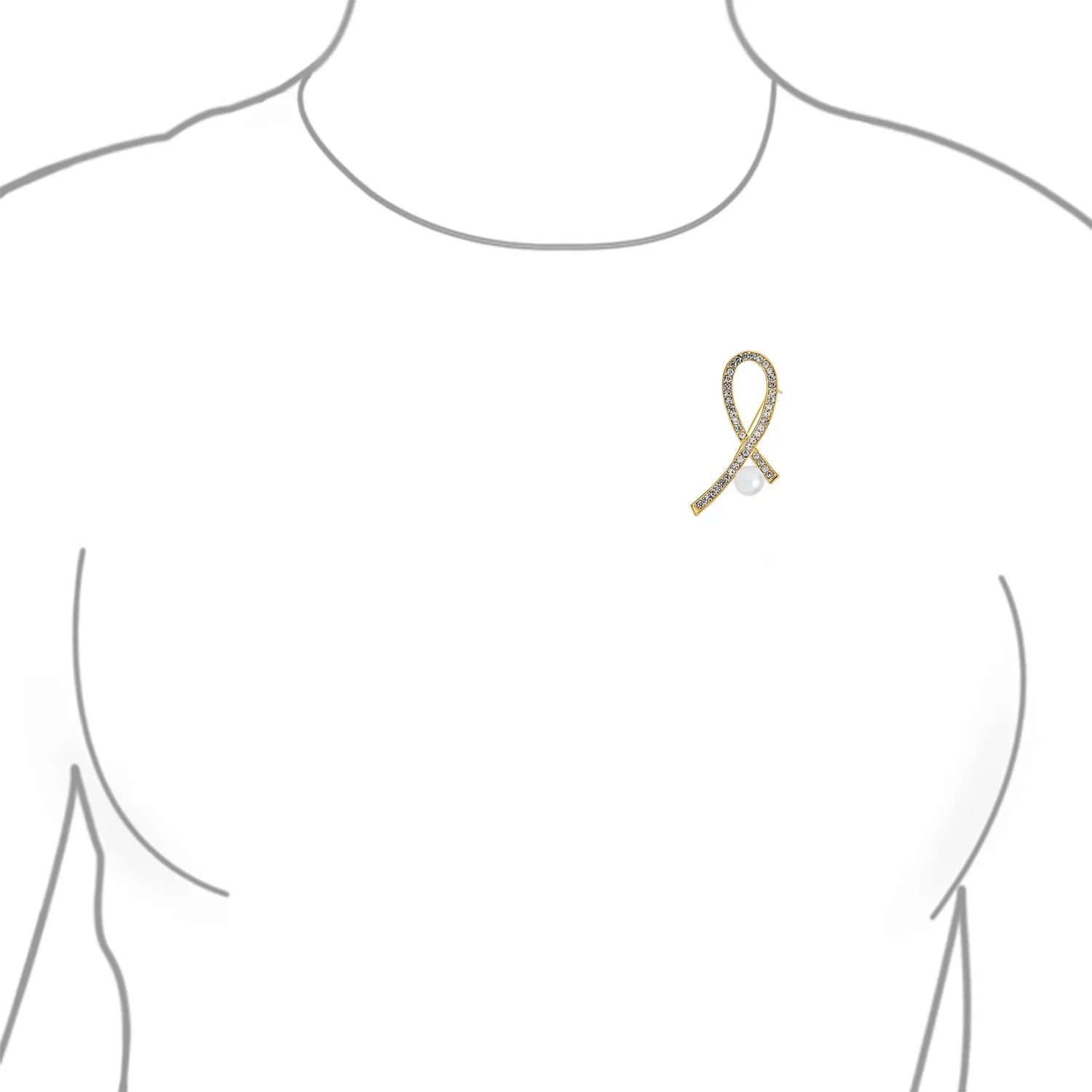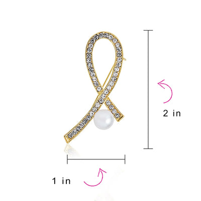 White Pearl Crystal Pave Pink Ribbon Breast Cancer Brooch Pin Gold Silver Plated