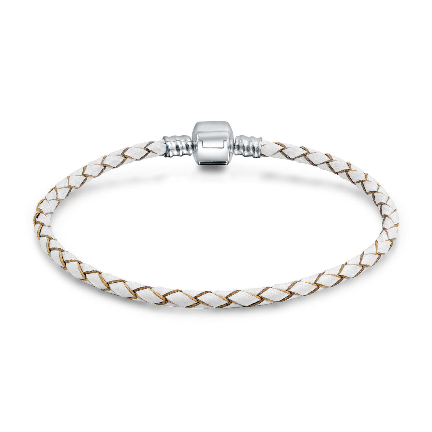 - Add our white braided leather bracelet to your jewelry box for when you need a casual, relaxed look. This 9 inch bracelet features a woven design and secure 925 sterling silver barrel clasp. It fits most bead charms and is a great gift for that laid back yet chic person in your life that loves to accessorize.