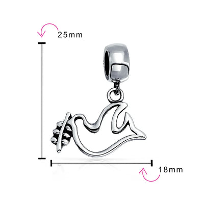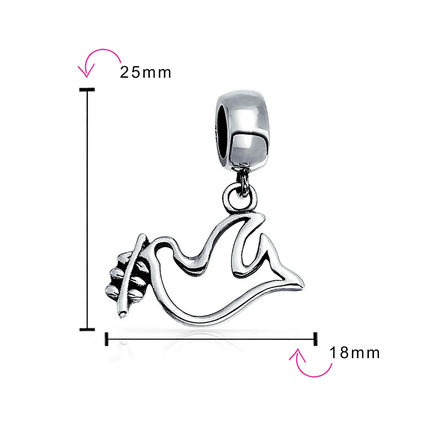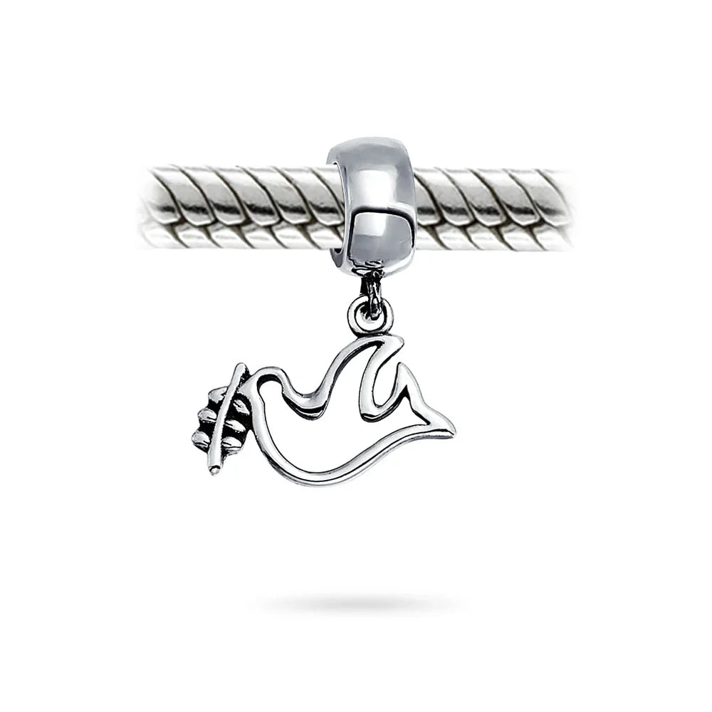 - This .925 Sterling Silver Dove of Peace charm adds elegance to Christmas bracelets. Features a dove with an olive branch. Perfect for religious or world peace jewelry designs.