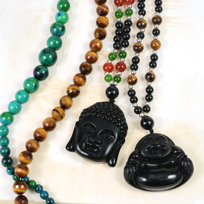 - This 2.4-inch pendant features a stunning 3D effect in shining black obsidian, depicting a laughing Buddha. It hangs from a 26-inch cord adorned with synthetic jade and agate beads, making it a powerful spiritual necklace.